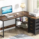 - Sturdy & Durable Construction: This computer desk with drawers is constructed of high-quality E1 particle board with a sturdy metal frame to ensure durability and large weight capacity. Equipped with adjustable feet to keep this corner computer desk stable even on an uneven floor
